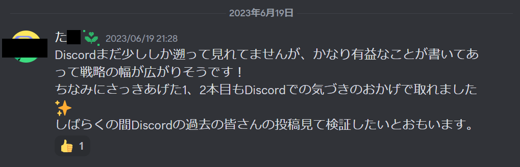 「かなり有益なことが書いてあって戦略の幅が広がりそうです!ちなみにさっきあげた1、2本目もDiscordでの気づきのおかげで取れました」