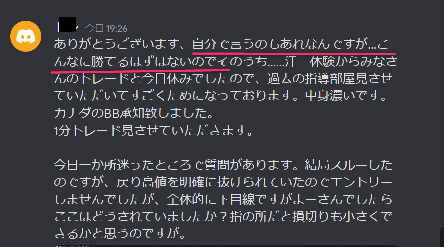 これは、コミュニティ内の「指導部屋」などで過去のトレードを徹底的に見直した結果、手法が体に馴染み始めた際によく起こる反応です。