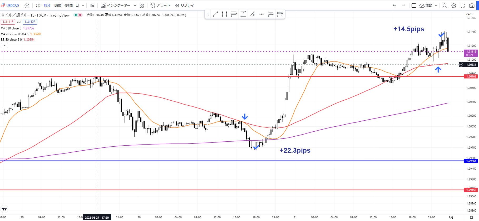 15分足に落とし込んで詳細なタイミングを計ります。