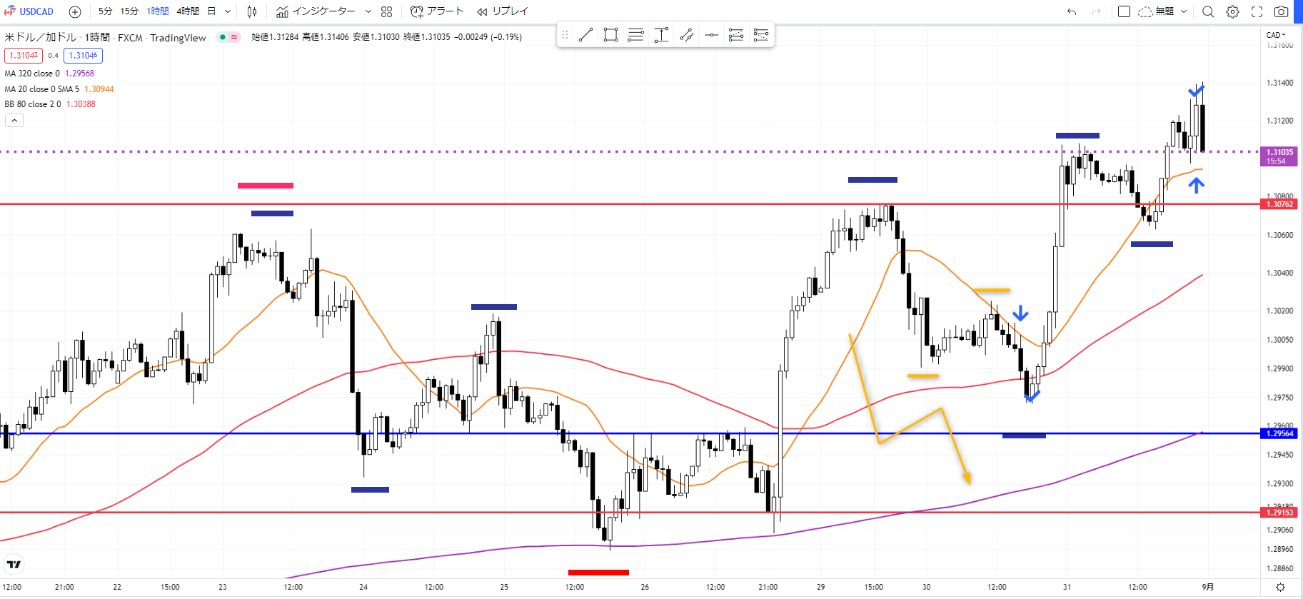 次に、ドルカナダの事例です。こちらは少し複雑ですが、値幅の考え方が非常に重要になります。
