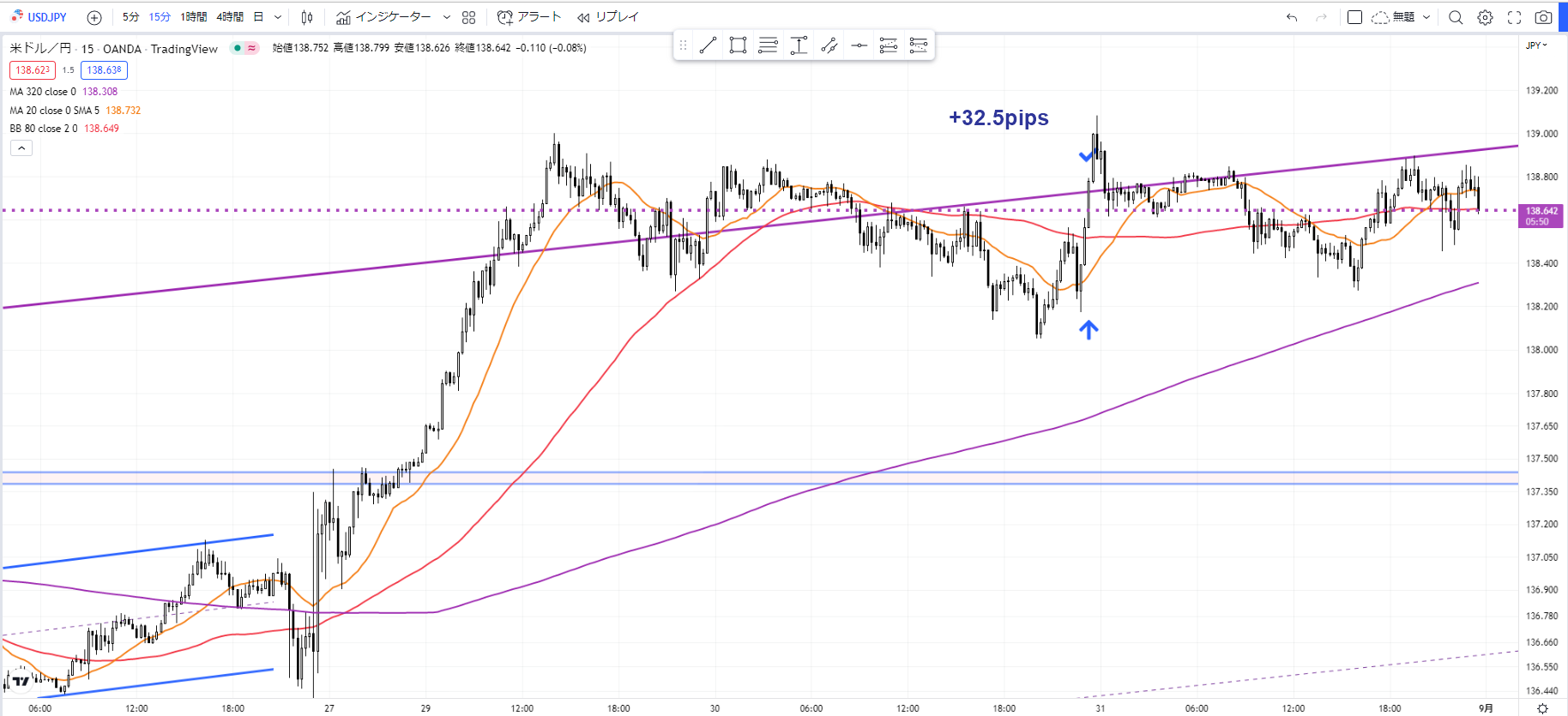 - 結果: 思惑通り上昇し、+32.5pipsを獲得。