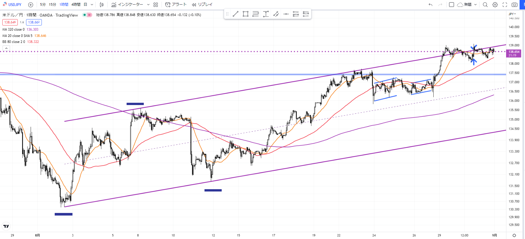 まずはドル円の1時間足から環境認識を行いました。
