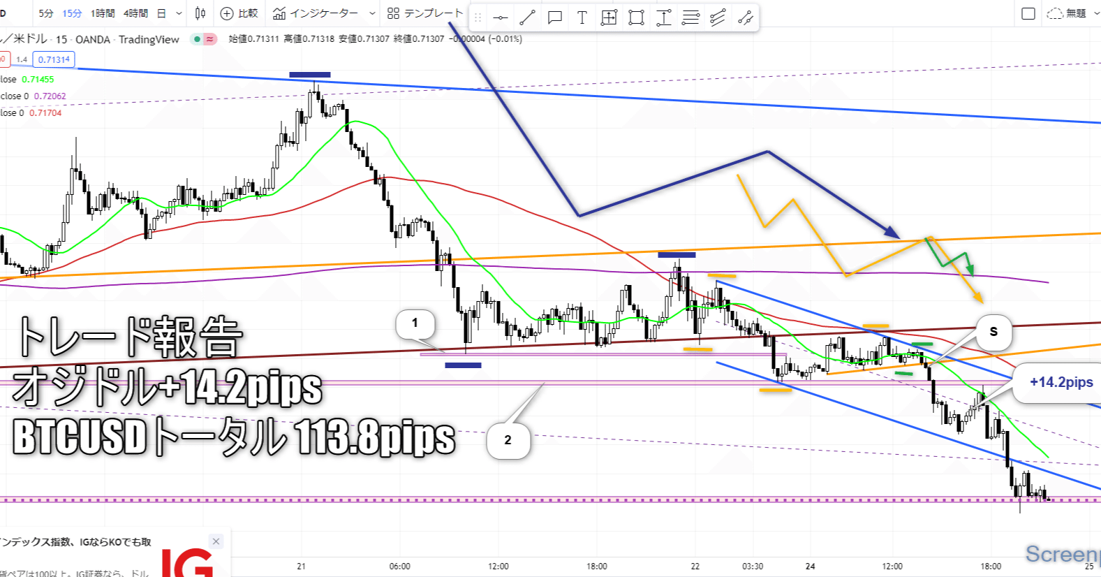 FXトレード報告 オジドル+14.2pips BTCUSDトータル 113.8pips|よー@FX📈📉