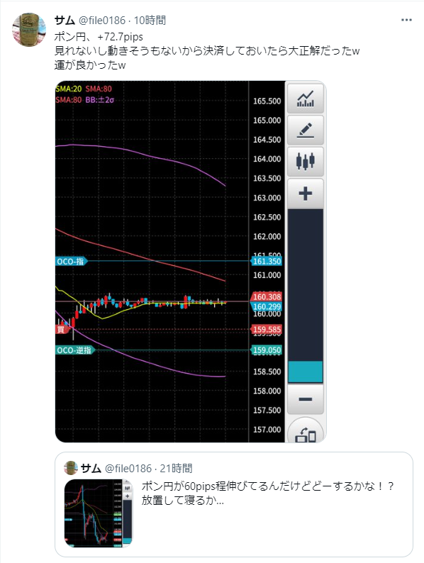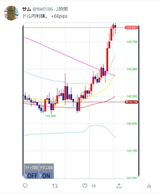 Twitter(現X)でもリアルタイムに近い形で発信していましたが、狙い通り一気に加速しました。結果は+68.0pips。