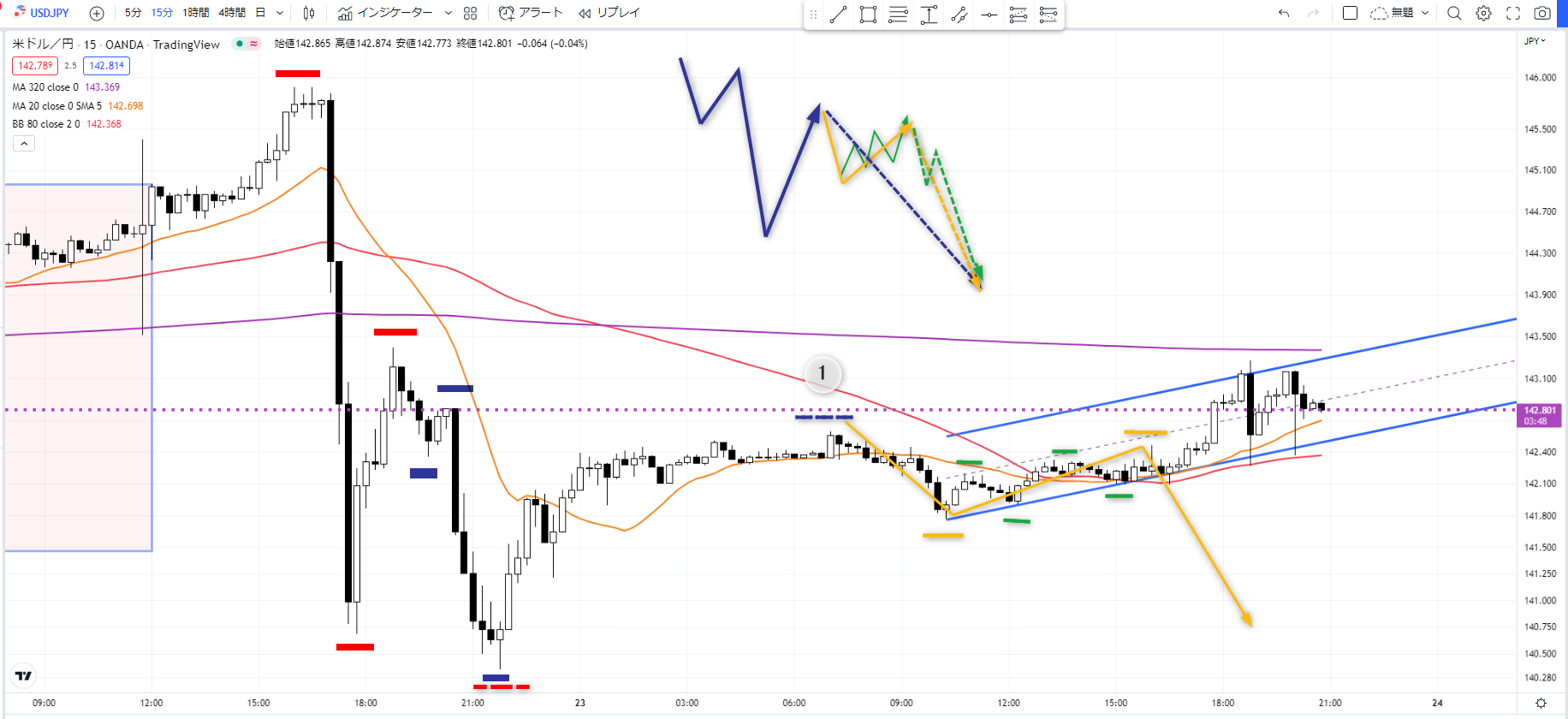 次に、エントリーのシナリオを描くため中波(15分足)に落とし込みます。