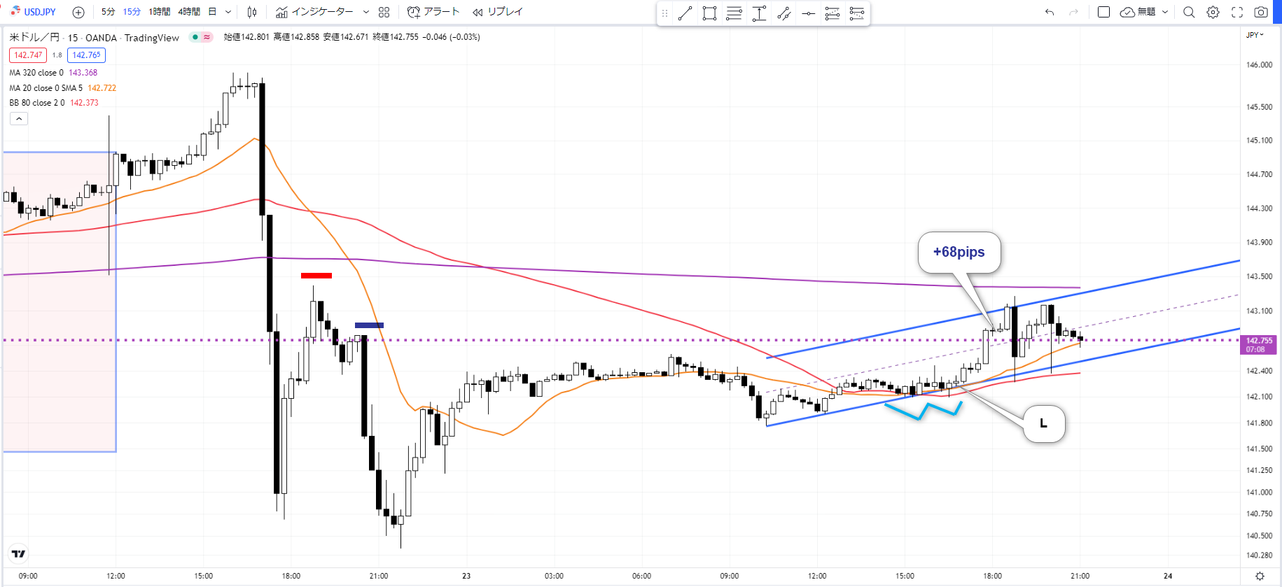 【ドル円】+68.0pips:小波とMAとラインの同期で優位性トレード