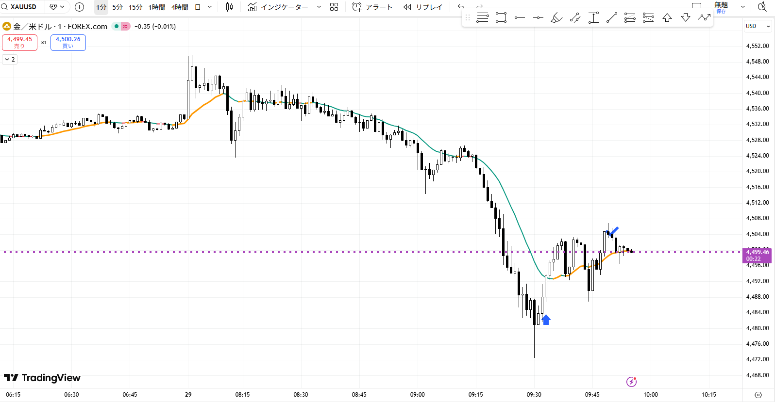 - 急落後の反発: 一気に$1(4,510.21)$付近まで下げた後のリバウンドを狙います。
