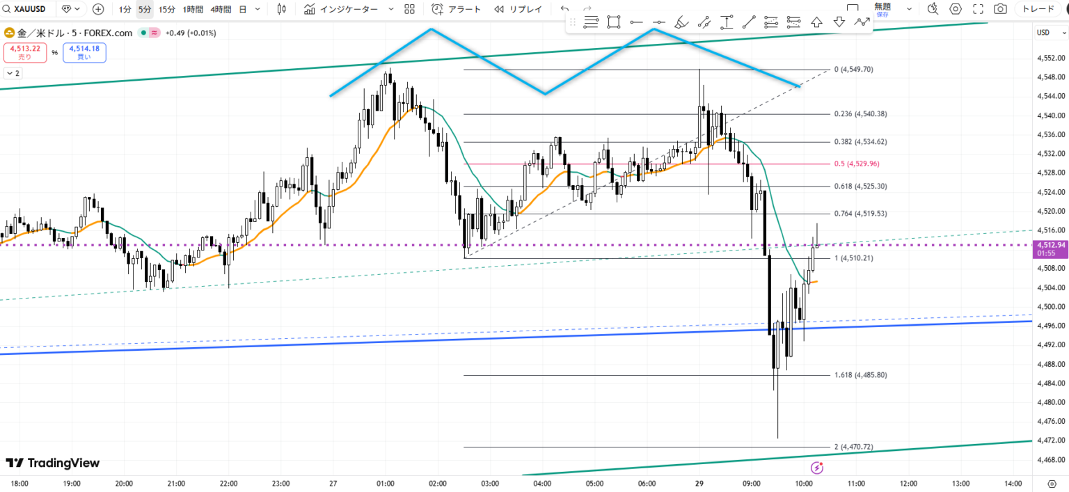 - フィボナッチの活用: $0.5$(4,529.96)や$0.618$のラインでどう反応するかを注視。