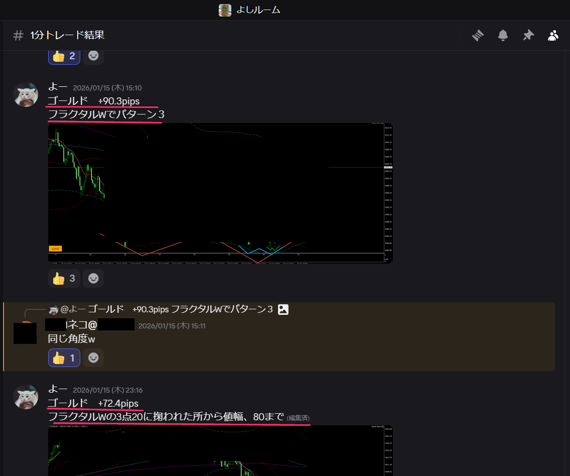コミュニティ内でも「同じ角度のW(ダブル)」や「3点20(移動平均線)に拘束された所からの値幅」など、精度の高い分析が共有されています。