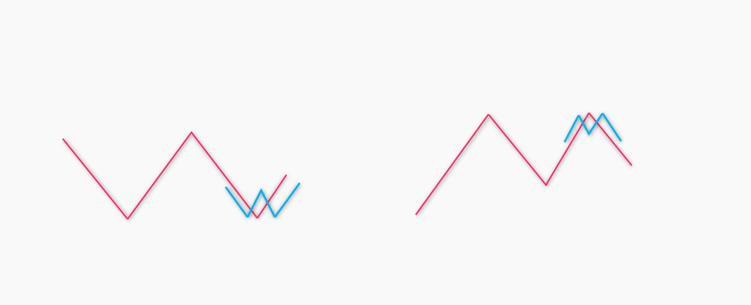 左図(下降からの反転): 大きなダブルボトム(赤)の右肩の中に、さらに小さなダブルボトム(青)が形成されています。