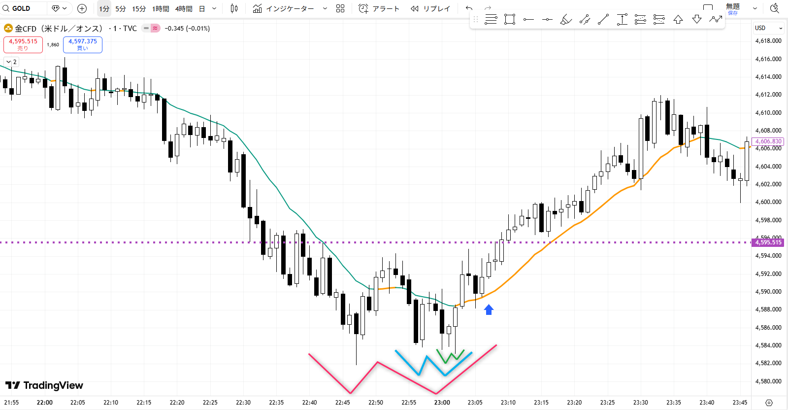 実際に1分足チャートで「フラクタルW」を捉えたポイントを解説します。