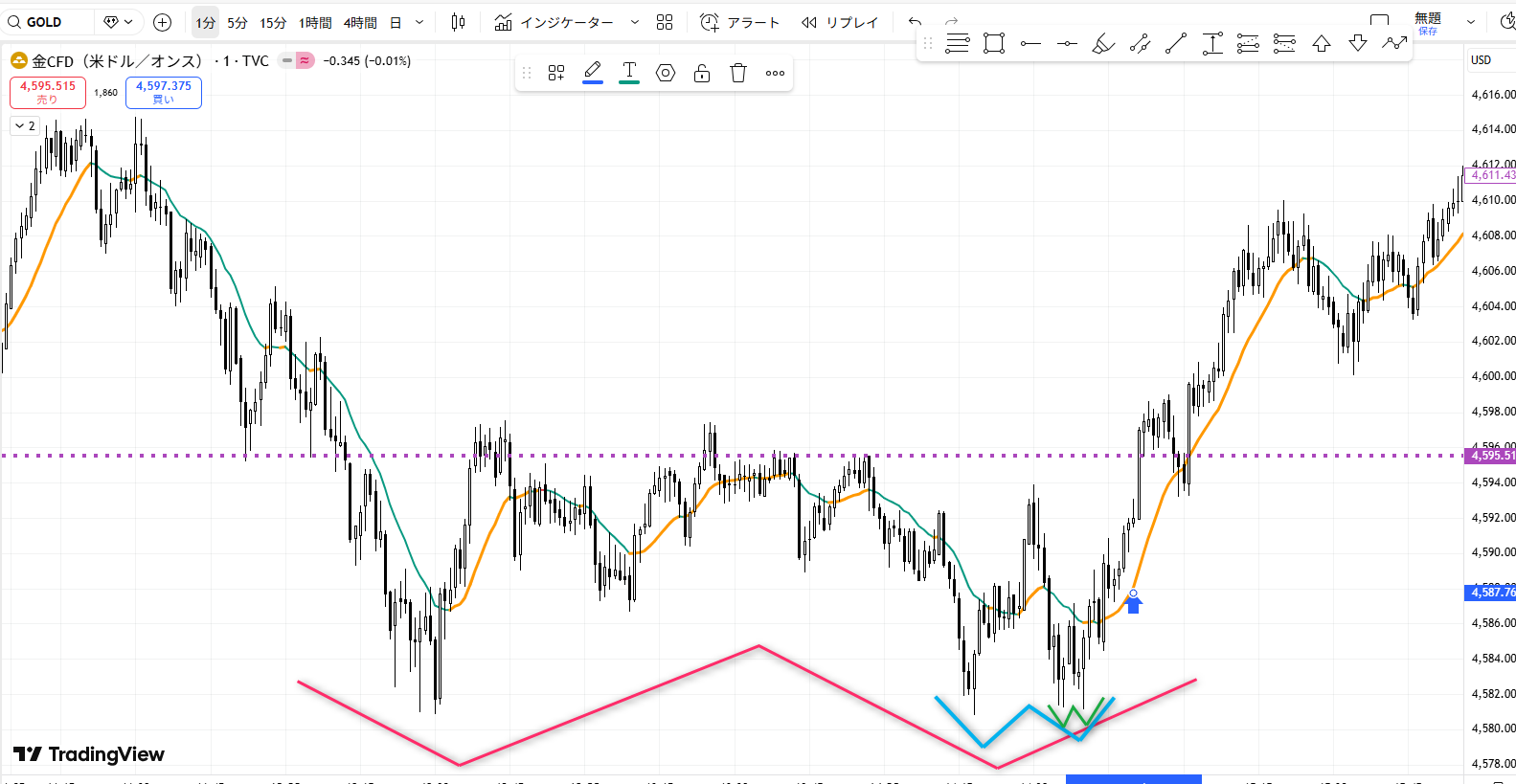 さらに細かく見ていくと、大きなダブルボトムの右肩の部分で、さらに小さなダブルボトムが重なっているのが分かります。