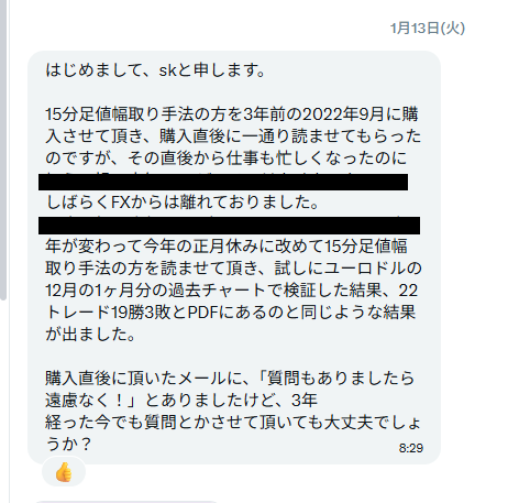 sk様は2022年9月に当手法を手にされましたが、直後にお仕事が多忙になり、しばらくFXの世界から離れていらっしゃいました。