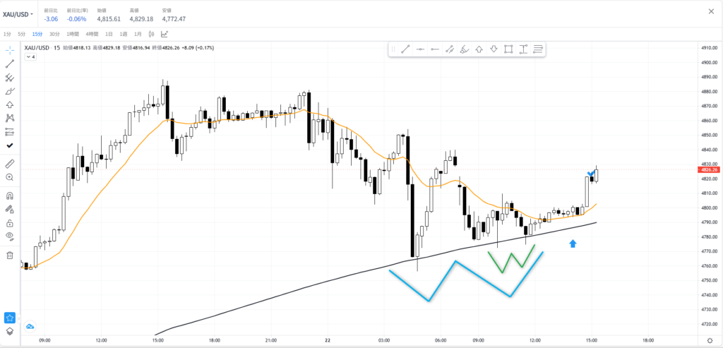 今回のエントリーの決め手は、「15分足200MAでのフラクタルダブルボトム」です。