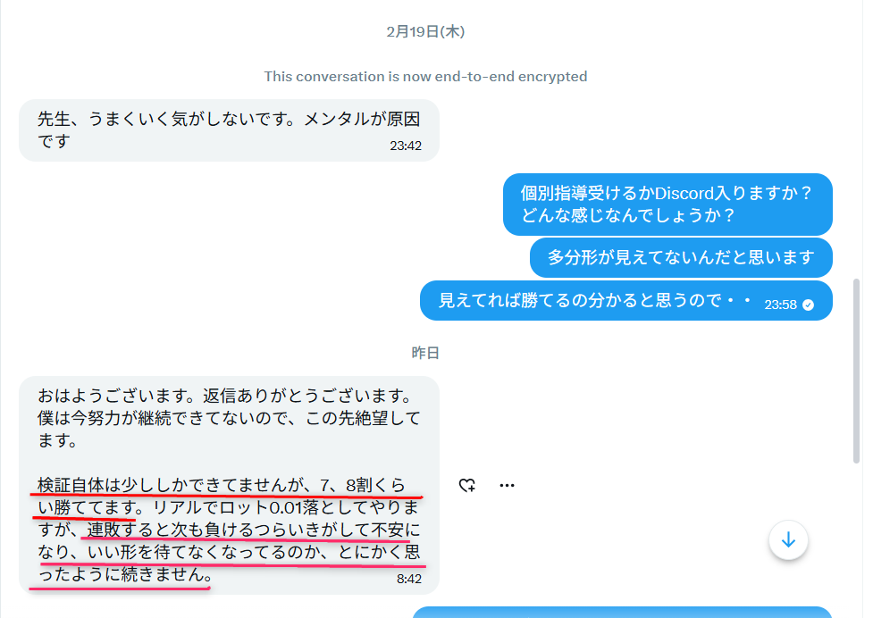 昨年11月に「15分足値幅取り手法」を手に取った読者様から、3ヶ月後に届いたDM。そこには、目を疑うような「実績」と「苦悩」が綴られていました。
