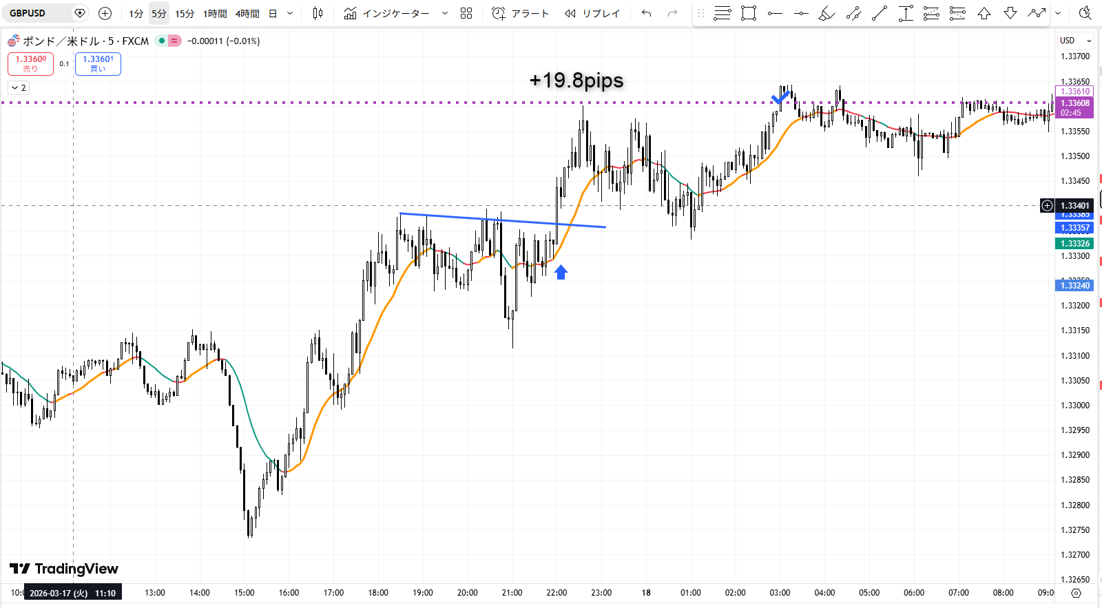 そんな中、柔軟に通貨ペアを切り替えて、私は昨晩、ポンドドル(GBP/USD)で+19.8pipsの利益を上げることができました。