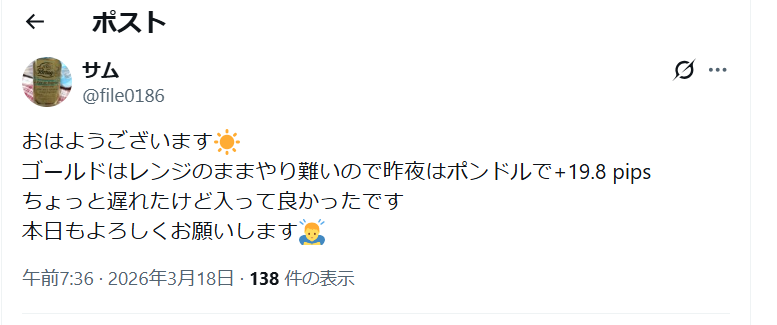 ゴールドがレンジでやり難いことを指摘し、ポンドドルへ切り替えた判断について呟いています。今回は、この「難しい相場を回避して、勝てる場所を見つける」環境認識のコツと、具体的なエントリー根拠について詳しく解説します。