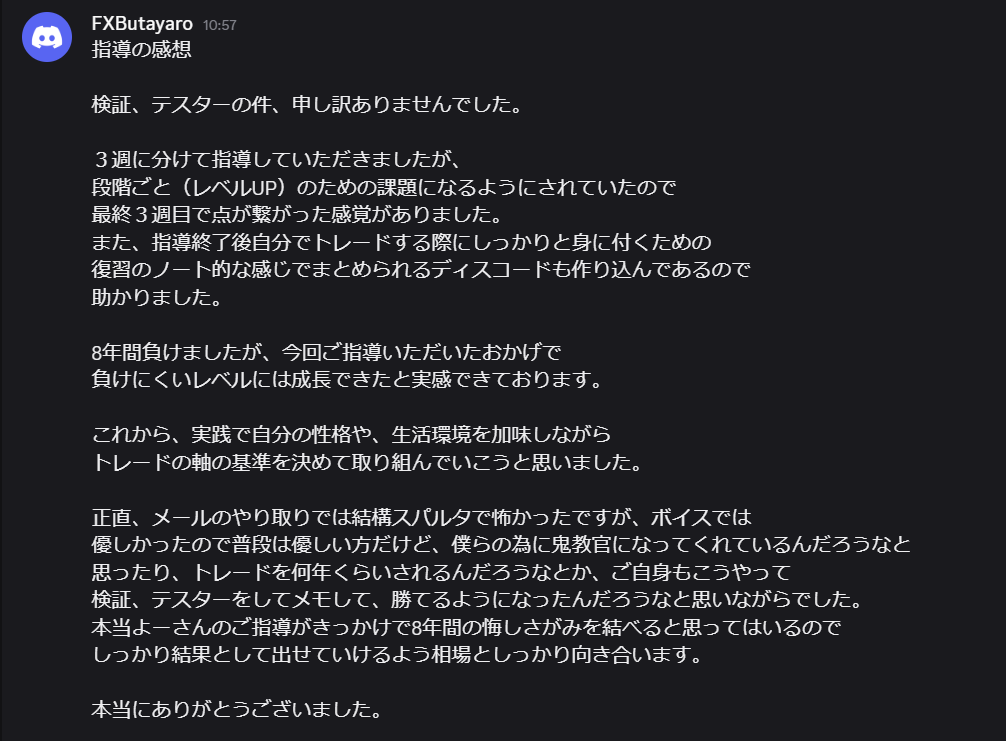FX個別指導を卒業するFXButayaroさんの言葉「8年間勝てなかった理由がハッキリ分かった」という感謝のチャット