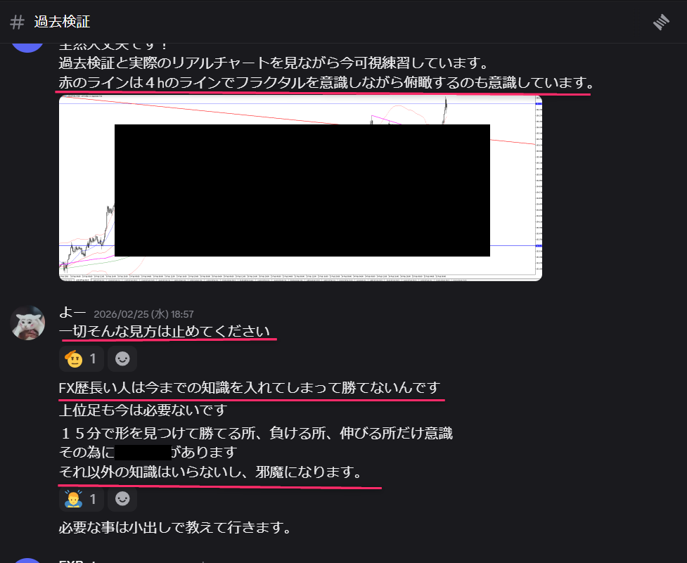 指導の核心は、相場の「本質的な形」を脳に焼き付ける「過去検証」です。