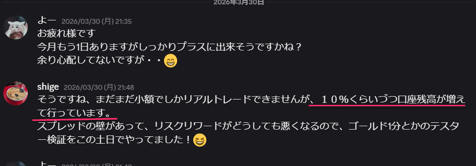彼は現在、「口座残高を10%ずつ確実に増やす」という、最も再現性の高い勝ち方を実践されています。