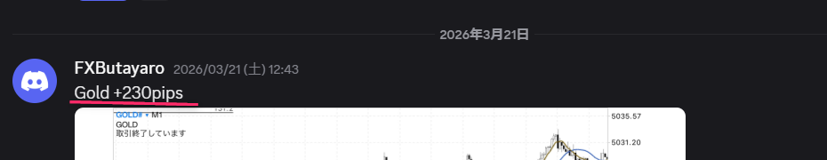 - Gold (1分足):1トレードで230pips。短期足でも波を捉えきっています。