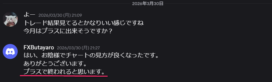 「はい、お陰様でチャートの見方が良くなりました。プラスで終われると思います。」