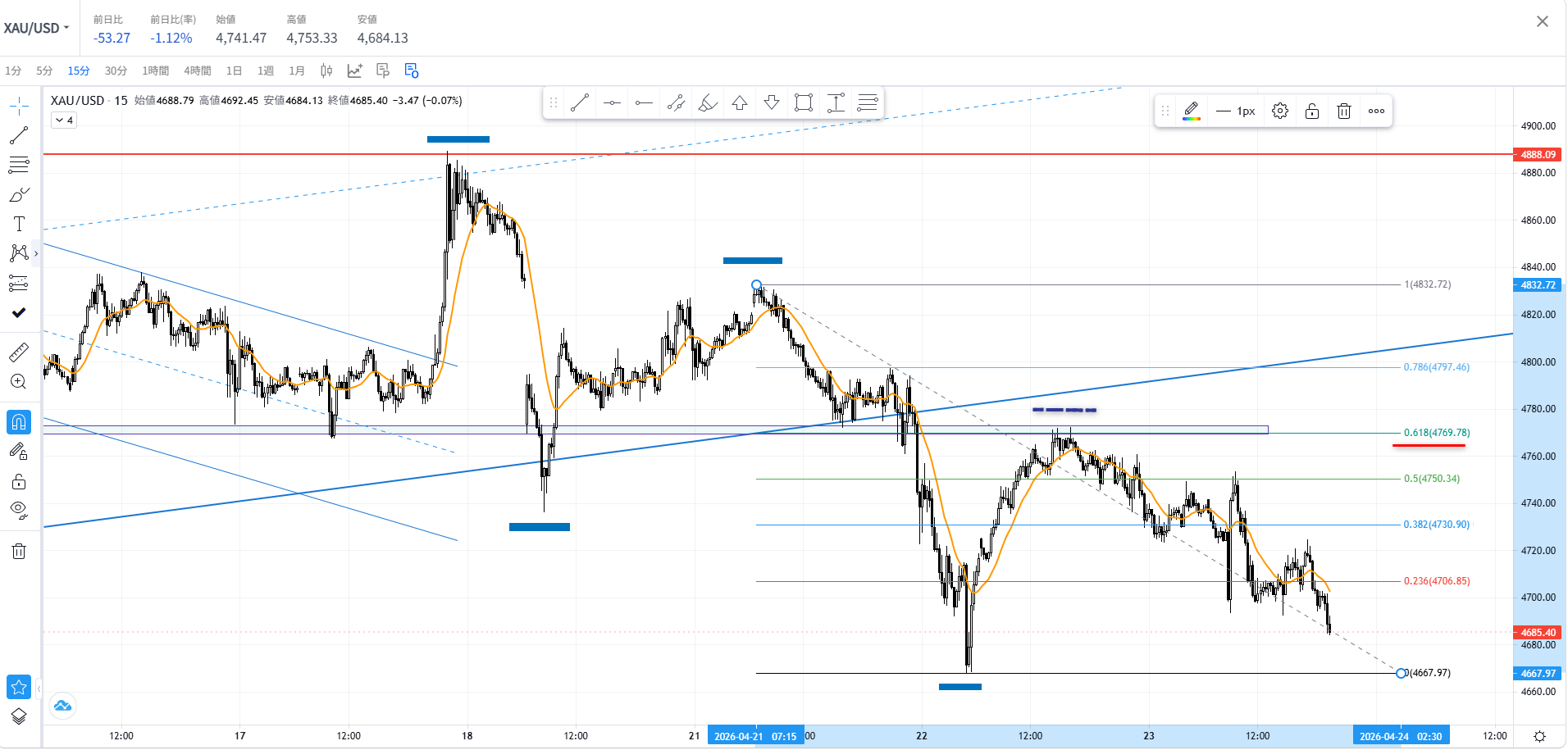 ゴールド15分足:下降トレンド中のフィボナッチ61.8%戻しポイント